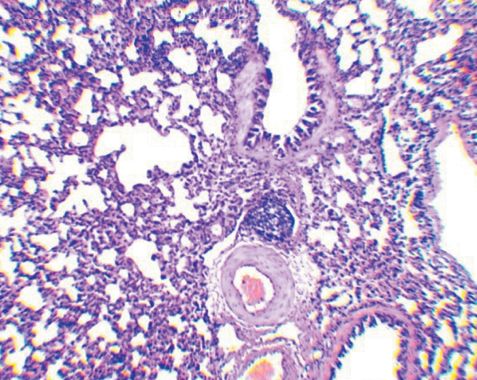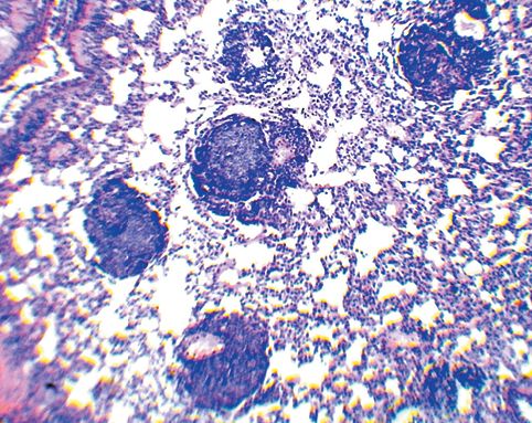 Рис. 2. Легкое морской свинки (группа № 2) - участки уплотнения разного размера в ткани легкого; лимфатический фолликул около бронха и кровеносного сосуда (окраска гематоксилином и эозином, ув. х50)  Рис. 3. Легкое морской свинки (группа № 2) - лимфатический фолликул без зоны размножения, формирующийся около сосуда (окраска гематоксилином и эозином, ув. Х100) У особей, вакцинированных БЦЖ, по сравнению группой № 1 (контроль) размножение эпителиоидных макрофагов в межальвеолярной ткани, а также скопление лимфоидной ткани возле бронхов, сосудов и в форме фолликулов в значительно меньшей степени выражено. Лимфоидные клетки образуют вдоль бронхов небольшого размера скопления. Периваскулярные муфты из лимфоидных клеток имеют небольшую ширину и протяженность, в них не наблюдается выраженный процесс формирования лимфатических фолликулов, но в сформировавшихся фолликулах сохраняется связь с кровеносными сосудами. В лимфатических фолликулах, в отличие от контрольной группы генеративные и реактивные центры не выражены. Меньший размер лимфатических фолликулов у морских свинок 2-й и 3-й опытной группе также подтверждается морфометрическими исследованиями, результаты которых представлены в таблице 1. Таблица 1 Морфометрические показатели лимфатических фолликулов BALT у морских свинок, инфицированных M. bovis, после введения противотуберкулезных препаратов, M±m | № группы (препарат) | Средний диаметр (мкм) | Средний радиус(мкм) | Средняя площадь (мкм2) | % | | №1 (контроль) | 203,0±8,8 | 101,5±4,4 | 34103,0±2766,5 | 89,0 | | №2 (конъюгат антигенов БЦЖ с бетулоновой кислотой) | 115,7±6,5** | 57,8±3,2** | 11458,4±1240,7** | 10,2 | | №3 (вакцина БЦЖ) | 155,0±9,1** | 77,2±4,4* | 20742,3±2386,4* | 0,4 | | Свиньи | 8 | 0,5 | 49 | 0,3 | | Всего: | 1590 | | 18976 | | Примечание: * - p<0,01; ** - p<0,001 Морфометрические исследования показали, что лимфатические фолликулы инфицированных морских свинок контрольной группы имеют диаметр 203,0±8,8 мкм, радиус 101,5±4,4 мкм и площадь 34103,0±2766,5 мкм2 (табл. 1). При инокуляции экспериментального конъюгата средний диаметр, радиус и площадь фолликулов в легких составили соответственно 115,7±6,5 мкм, 57,8±3,2 мкм и 11458,4±1240,7 мкм2 и были по сравнению с морскими свинками контрольной группы значительно меньшими, о чем свидетельствовало достоверное снижение указанных показателей в 1,75-2,97 раза. У морских свинок, иммунизированных вакциной БЦЖ, также в значительной степени отличались от контрольной группы, на что указывало достоверное уменьшение анализируемых морфометрических параметров в 1,31 - 1,64 раза. Эти показатели были выше, чем в группе особей, подвергнутых обработке экспериментальным конъюгатом. При гистологическом исследовании легких морских свинок, инфицированных вирулентным штаммом микобактерий, установлено, что формирующийся иммунный ответ на генерализацию возбудителя сопровождается размножением лимфоидных клеток вокруг кровеносных сосудов и бронхов разного калибра и образованием типичных лимфатических фолликулов. Преимущественное обнаружение лимфоидной ткани в виде клеточных муфт различной ширины и длины вокруг кровеносных сосудов указывает на гематогенную диссеминацию возбудителя. Разрастаясь эксцентрично, лимфоидные муфты, локализующиеся вокруг кровеносных сосудов, формируют множество фолликулов с центрами размножения и реактивными центрами, которые, по нашему мнению, относятся к iBALT, являющейся свидетельств
