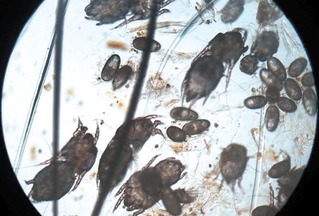 Рис. 3. Клещи Chorioptes bovis и их яйца в соскобе с мест поражения кожи. Корова инв. № 500. (увеличение *150). Фотография Абрамова А.В.