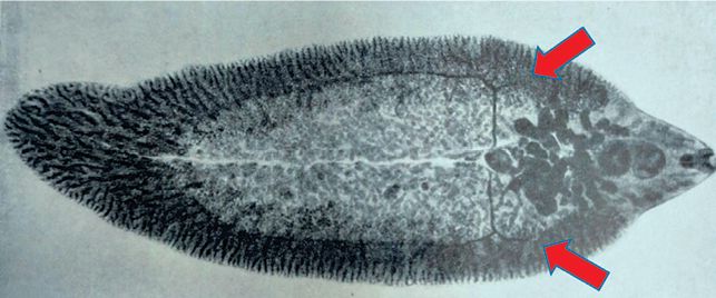Рис. 1. Марита трематоды вида Fasciola hepatica (стрелочками указаны «плечики») (по Капустину В.Ф. [23]) Кутикула фасциол покрыта шипиками [20, 31, 32]. Фасциолы являются биогельминтами [2, 11, 20, 30, 31, 32], в их биологии развития принимают участие промежуточные хозяева - пресноводные моллюски вида Lymnaea truncatula (син. Galba truncatula) (Muller, 1774) [31, 39]. Мариты фасциол в желчных ходах печени продуцируют яйца, которые вместе с током фекалий больных животных выбрасываются во внешнюю среду при дефекации животных [8, 31, 32]. По данным Скрябина К.И., Шульца Р.С. [20], половозрелая марита ежесуточно способна откладывать до 140000 яиц. Яйца фасциол трематодного типа, овальной (яйцевидной) формы, с гладкой внешней оболочкой, длиной 0,13-0,15 мм, шириной 0,07-0,09 мм. Окраска яиц золотистая или соломенно-желтая с коричневым отливом. На одном полюсе - крышечка, на другом - еле заметный бугорочек. Желточные клетки заполняют все внутреннее пространство яиц [20, 23, 31]. Яйца, выделенные во внешнюю среду, содержат оплодотворенную яйцеклетку, а также желточные клетки. Во внешней среде в пресной воде при благоприятных условиях (Т воздуха 20-28°С) яйца становятся инвазионными примерно за 12-19 суток. По данным многочисленных авторов, источник заражения овец - это болотистые пастбища и пойменные луга, неблагополучные по инвазии, поскольку являются биотопами для промежуточных хозяев [2, 20, 31, 32]. Овцы заражаются при проглатывании адолескариев (инвазионных личинок) на пастбищах или при водопое [2, 20, 31, 38]. Также животные могут заражаться фасциолезом при содержании в помещениях и при скармливании им травы, скошенной с неблагополучных по фасциолезу пастбищ [2, 22]. Источником распространения болезни являются больные фасциолезом домашние, а также дикие жвачные, зайцы и некоторые другие животные [2, 25, 31]. Фасциолез молодняка овец протекает нередко остро, а у взрослого поголовья в основном хронически. Острое течение болезни обусловлено проникновением значительного числа молодых форм фасциол в желчные ходы печени (клинически проявляется через 60-65 суток после заражения животных) [31]. Хроническое течение болезни длится месяцами и обусловлено паразитированием половозрелых гельминтов (марит) в желчных ходах печени [2, 31, 32]. Точный диагноз на хронически протекающий фасциолез животных устанавливают на основании гельминтокопрологических исследований, проводимых с целью обнаружения яиц гельминтов (гельминтоовоскопия) [2, 11, 13, 20, 31, 32]. При фасциолезе наиболее целесообразным при постановки исследований является метод последовательных промываний [31]. В настоящей работе была поставлена цель - выявить распространение фасциолеза среди овец, содержащихся в хозяйствах разных форм собственности, расположенных на территории 7 районов Владимирской области. Материалы и методы исследований. Исследовательскую работу провели в 2024 году в хозяйствах разных форм собственности на территории 7 районов Владимирской области и на кафедре паразитологии и ветеринарно-санитарной экспертизы ФГБОУ ВО МГАВМиБ - МВА имени К.И. Скрябина. С целью диагностики фасциолеза обследованию было подвергнуто 176 овец разных пород, в том числе романовской, дорпер, восточно-фризской и других пород. Все обследуемые животные были 2-4 летнего возраста. Пробы фекалий для исследований от каждого животного брали индивидуально из прямой кишки. Затем помещали в отдельный па