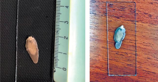 Рис. 2, 3. Яйца трематоды вида Fasciola hepatica (стрелочкой указана крышечка; фото: Акбаев Р.М.) Данные исследований о распространенности фасциолеза овец представлены в таблице 1. Таблица 1 Распространенность фасциолеза овец, содержащихся в хозяйствах разных форм собственности, расположенных на территории 7 районов Владимирской области | Район Владимирской области | Исследовано, особей | Инвазированно, особей | ЭИ, % | | Гусь-Хрустальный | 23 | 3 | 13 | | Камешковский | 26 | 0 | 0 | | Кольчугинский | 25 | 0 | 0 | | Судогодский | 25 | 9 | 36 | | Собинский | 24 | 24 | 100 | | Суздальский | 27 | 10 | 37 | | Гороховецкий | 26 | 8 | 30 | | Всего исследовано | 176 | 54 | 30,7 | На основании проведенных исследований, приведенных в таблице 1, фасциолез выявлен у животных, содержащихся в хозяйствах, расположенных на территории 5 из 7 районов Владимирской области, что свидетельствует о широком распространении гельминтоза. При этом экстенсивность инвазии составила от 13% (Гусь-Хрустальный район) до 100% (Собинский район). В биоматериале от животных, содержащихся в хозяйствах, расположенных в двух районах (Кольчугинском и Камешковском), яйца фасциол не обнаружили. Также отмечаем тот факт, что интенсивность инвазии при хроническом течении фасциолеза животных невелика, поскольку в трех полях зрения микроскопа мы обнаружили от 1 до 3 яиц фасциол. Клинические признаки болезни животных с подтвержденным диагнозом на фасциолез не проявлялись. При вскрытии четырех овец и исследовании желчных протоков печени были обнаружены мариты фасциол (рисунок 4 и 5).  Рис. 4, 5. Мариты трематоды вида Fasciola hepatica (фото: Акбаев Р.М.) Заключение. В результате проведенных исследований выяснили, что на территории Владимирской области в хозяйствах разных форм собственности широко распространен фасциолез овец, вызываемый трематодами, относящимися к виду Fasciola hepatica (Linnaeus, 1758). По результатам гельминтокопроско-пических исследований биоматериала от 176 овец по методу последовательных промываний в модификации Акбаева М.Ш., в 54 пробах были обнаружены яйца гельминта указанного вида. Таким образом, экстенсивность инвазии составила 30,7%. Кроме того, при послеубойном осмотре желчных протоков печени овец были обнаружены мариты гельминтов. Список литературы: 1. Абонеев В. В., Марченко В. В., Горковенко Л. Г., Куликова А. Я. Комплексная оценка потомства производителей южной мясной и кавказской пород овец. Главный зоотехник. 2017; (5): 5-13. 2. Акбаев М. Ш., Архипов А. В., Акбаев Р. М. Романовские овцы в условиях фермерских и индивидуальных хозяйств Нечерноземья: (разведение, кормление, содержание, профилактика и лечение некоторых заразных и незаразных болезней). 2016: 156 с. 3. Акбаев Р. М. Эктопаразиты кур и зоофильные мухи в промышленном птицеводстве и усовершенствование мер борьбы с ними в условиях Московской области : специальность 03.00.19 : диссертация на соискание ученой степени кандидата ветеринарных наук. 2003: 159 с. 4. Акбаев Р. М. Эктопаразиты птицы на территории птицефабрик промышленного типа Нечерноземной зоны. Ветеринария. 2009; (10): 32-38. 5. Акбаев Р. М. К вопросу о фауне эктопаразитов птиц в частных птичниках. Ветеринария. 2010; (8): 36-40. 6. Акбаев Р. М. Дифференциальная диагностика клещей - возбудителей сар-коптоидозов животных и птиц. 2011: 71 с. 7. Акбаев Р. М. Дезинсекция и дезакаризация птицеводческих помещений. Птица и птицепродукты. 2011; (4): 14-15. 8. Акбаев Р. М., Бабичев Н. В. Использование те