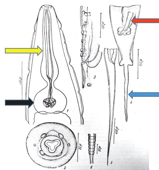 Рис. 1. Фрагменты тела нематод вида Passalurus ambiguus (Rudolphi, 1819) по Шульцу [34]: 1 – головной конец самки (желтой стрелкой отмечен пищевод; черной – бульбус); 2 – головной конец самки апикально; 4 – хвостовой конец самца (красной стрелкой отмечена спикула; голубой – тонкий отросток); 5 – хвостовой конец самки; 6 – кольцевидные образования кутикулы впереди хвостового острия у самки  Рис. 2. Яйца и личинки нематоды вида Passalurus ambiguus на разных стадиях развития (по Харичковой) [33] Локализация. Нематоды Passalurus ambiguus локализуются в слепой и ободочной кишках зайцеобразных. Имагинальные сам-ковые особи в период откладки яиц мигрируют к прямой кишке и локализуются у выхода из ануса [28,30,32,33,40,41]. Биология развития. Развитие пассалурусов протекает по ок-сиуридному типу [27, 28, 33], без участия промежуточных хозяев. Таким образом, пассалурусы являются геогельминтами [8]. Самцы, оплодотворив самок, погибают и впоследствии выбрасываются наружу во внешнюю среду вместе с фекалиями. Оплодотворенные самки продвигаются из слепой и прямой кишки к анусу, где у выхода откладывают яйца между криптами стенки кишечника, или на шерсть вокруг ануса. Впоследствии самки также погибают. Часть яиц попадают во внешнюю среду вместе с фекалиями. Инвазионной стадии яйца, отложенные в перианальной зоне или попавшие во внешнюю среду, достигают за 24-48 ч [27, 28]. В яйцах в этот период растут, развиваются и созревают личинки третьей стадии (larva III). Кролики заражаются, проглатывая такие яйца. В организме животных личинки достигают стадии имаго через 1,5 – 3 недели. Продолжительность жизни нематод составляет 60-100 суток [28]. Эпизоотологические данные. Пассалуроз – широко распространенная болезнь кроликов, содержащихся в хозяйствах разных форм собственности на территории России. Зарегистрирован в хозяйствах Кировской [15], Московской [24], Владимирской [19], Омской [22], Ленинградской [26], Кемеровской [29], Иркутской [16] областей, Краснодарского [39], Хабаровского [35] и Ставропольского [38] краях, во Владивостоке [31]. Источник заражения животных – это больные кролики и носители инвазии [14, 27]. Заражение животных пассалурозом происходит при поедании корма или питье воды, загрязненных инвазионными яйцами гельминтов. Поскольку кролики испытывают зуд при выхождении гельминтов из ануса (в особенности самок, откладывающих яйца), то кролики часто расчесывают передними лапками или вылизывают анальную область, таким образом происходит повторное заражение [32, 33]. Кролики подвержены копрофагии или цекотрофии (лат. caecum – слепая кишка + греч. trophe – пища, питание) [8, 14]. Данное явление распространено у кроликов вследствие недостатка в рационе минералов и протеинов. Кроликам для нормального деятельности желудочно-кишечного канала необходимы цекотрофы – комочки бактерий, выделяющиеся из ануса в результате их бурного размножения в аппендиксе и слепой кишке [27]. Заглатывая цекотрофы, кролики одновременно заглатывают и яйца. По данным некоторых авторов, молодые животные заражаются чаще и значительно интенсивнее [28], и в неблагополучных по пассалурозу хозяйствах зараженными могут быть до 50-90% кроликов при интенсивности инвазии до нескольких десятков тысяч гельминтов у одного животного [27]. К примеру, по данным Акбаева М.Ш., при проведении исследовательской работы на кро-ликофермах на территории Московской области интенсивност