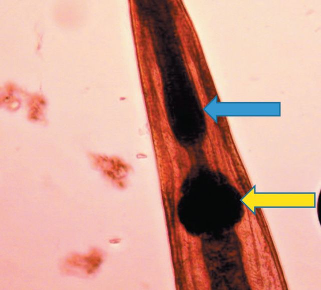 Рис. 3. Яйцо Passalurus ambiguus (Rudolphi, 1819) (фото: Акбаев Р. М.) В биоматериале от остальных 60 кроликов яйца пассалурусов не обнаружили. В свежих фекалиях обследуемых больных животных нами были обнаружены гельминты, которых мы морфологически идентифицировали как нематод Passalurus ambiguus (рисунок 4).