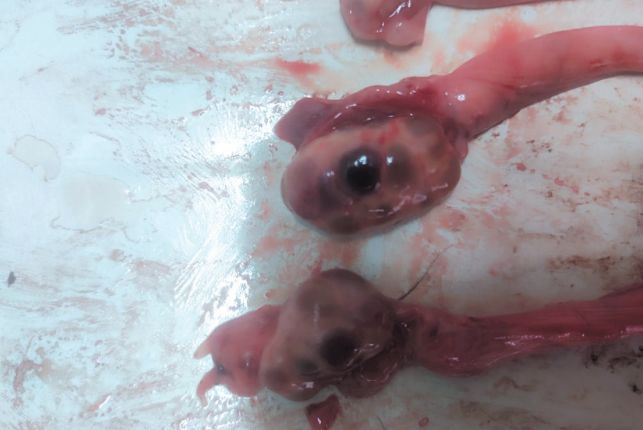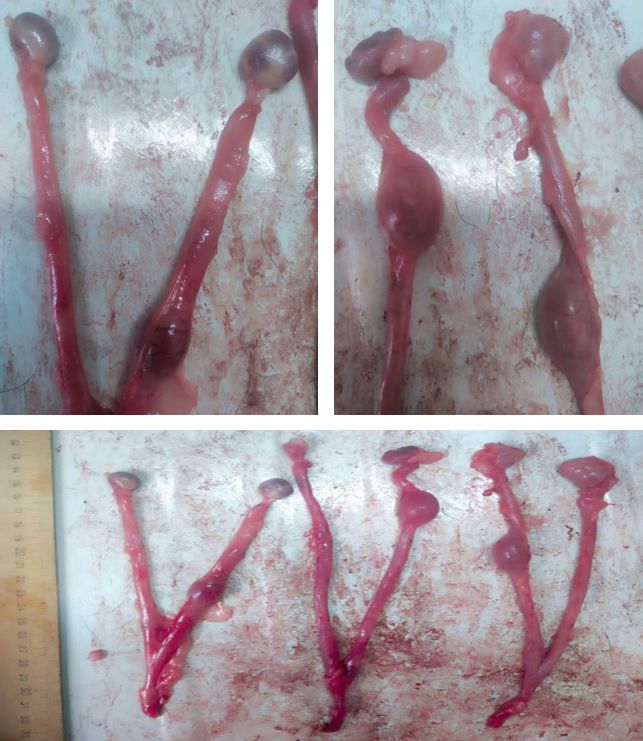 Рис. 1. Яичник с фолликулами  Рис. 2. Локальные участки шаровидного образования в рогах маток Исследования внутренних репродуктивных органов (яичников и матки) лисиц проводились в период весеннего забоя. Были установлены утолщения рогов матки, некоторые с гнойным содержимым; на некоторых рогах матки отмечались шаровидные образования (рисунок 2). При разрезе этих новообразований обнаруживали густую коричневую массу. Макроскопически яичники имели бугристую поверхность с признаками наличия желтого тела и фолликулов. При гистологическом исследовании установлено кровенаполнение вен миометрия. Миометрий в состоянии резкой компрессии, заметны массивные некрозы клеток и тотальное отхождение эндометрия в просвет. В строме шейки матки визуализируется слабая лимфоидно-клеточная инфильтрация, просвет шейки матки расширен, эпителий с признаками вакуолизации цитоплазмы. В просвете рога матки, в данном участке, предположительно, заметны клетки трофобласта, однако их дифференцировка значительно затруднена (рисунок 3). В участках рога матки без расширения, ближе к описываемому выше участку визуализируется массивный пласт, в просвете, состоящий из десквамированного цилиндрического эпителия слизистой оболочки матки, некротических масс и оксифильного вещества. Чуть дистальнее, заметна массивная десквамация эпителиального слоя в просвет матки, железы эндометрия здесь расширены, с обильным секретом (рисунок 4). В корковом слое яичника выявлены фолликулы на разной стадии развития, и обильная инфильтрация стромы яичника лимфоцитами, единично – атрети-ческие тела. В препарате выявлено два массивных жёлтых тела с тенденцией к васкуляризации лютеоцитов. Просвет шейки матки расширен, содержит оксифильный экссудат, эпителий с признаками вакуолизации (рисунок 5). Частота встречаемости эндометритов у лисиц представлена в таблице 1. Таблица 1 Частота встречаемости эндометрита у лисиц | эндометрит | 1 | 2% | | эндометрит и цервицит | 3 | 6% | | железисто-кистозная гиперплазия эндометрия, эндометрит и оофорит | 4 | 8% |