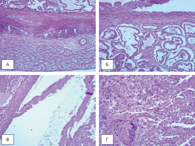Рис. 3. Гистологические срезы: а – поперечный и продольный слои миометрия; б, в – резкое расширение желёз эндометрия; г – просвет рога матки с некротическими массами (гематоксилин и эозин, х100)  Рис. 4. Гистологические срезы эндометрия (гематоксилин и эозин, х100)  Рис. 5. Гистологические срезы: а – корковое вещество яичника с воспалением стромы; б – корковое вещество яичника с воспалением стромы; в – жёлтое тело с вакуляризацией цитоплазмы лютеоцитов, в краевых отделах; г – два жёлтых тела с соединительнотканной перегородкой (гематоксилин и эозин, х100) Заключение. По результатам проведенных исследований установлено, что у лисиц пропустовало 94% самок из 2000. Результаты гистологических исследований репродуктивных органов лисиц указывают на возможные нарушения гормонального фона в их организме. Список литературы: 1. Кочуева Н. А., Бочкарев В. Н., Гарнцева Н. В. Адаптационные процессы в организме плотоядных при остром послеродовом эндометрите. Ветеринарная патология. 2008; (2): 84-88. 2. Слугин В. С. Болезни плотоядных пушных зверей и их этиологическая связь с патологией других животных и человека. КОГУП «Кировская областная типография». 2004: 592 с. 3. Чекалова Т. М., Матвеева С. В. Анализ воспроизводительной способности стада Вятских красных лисиц «огневок». МГАВМиБ им. К.И. Скрябина. 2001: 266-267. 4. Емельянова Н. С. Эндометриты домашних плотоядных. 2007: 22 с. 5. Владимиров А. В., Еремина Т. С., Семикрасова А. Н., Писаренко Н. А. Система гинекологической диспансеризации песцов и лисиц. Российский ветеринарный журнал. 2007: 45. 6. Меркулов Г. А. Курс патолого-гистологической техники. Медицина. 1969: 422 с. 7. Sorum H. et al. An Outbreak of Septic Endometritis in the Arctic Blue Fox (Alopex Lagopus) caused by Clostridium Carnis. Acta vet. scand. 1988; (29): 181-191. Сведения об авторах: Жилина Ксения Владимировна, ветеринарный врач лаборатории экспериментального кролиководства ФГБНУ «Научно-исследовательский институт пушного звероводства и кролиководства имени В.А. Афанасьева»; 140143, Московская область, Раменский район, пос. Родники, ул. Трудовая, 6; e-mail: niipzk@mail.ru. Ответственный за переписку с редакцией: Семикрасова Алла Николаевна, кандидат биологических наук, научный консультант ФГБНУ «Научно-исследовательский институт пушного звероводства и кролиководства имени В.А. Афанасьева»; 140143, Московская область, Раменский район, пос. Родники, ул. Трудовая, 6; тел.: 8-496-4648681; e-mail: niipzk@mail.ru. Заявленный вклад авторов: рукопись была написана благодаря вкладу всех авторов. Все авторы одобрили окончательную версию рукописи. Конфликт интересов: авторы заявляют об отсутствии конфликта интересов.
