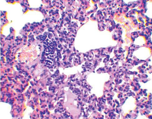 Рис. 2. Легкое морской свинки (группа № 2) - участки уплотнения разного размера в ткани легкого; лимфатический фолликул около бронха и кровеносного сосуда (окраска гематоксилином и эозином, ув. х50)  Рис. 3. Легкое морской свинки (группа № 2) - лимфатический фолликул без зоны размножения, формирующийся около сосуда (окраска гематоксилином и эозином, ув. Х100) У особей, вакцинированных БЦЖ, по сравнению группой № 1 (контроль) размножение эпителиоидных макрофагов в межальвеолярной ткани, а также скопление лимфоидной ткани возле бронхов, сосудов и в форме фолликулов в значительно меньшей степени выражено. Лимфоидные клетки образуют вдоль бронхов небольшого размера скопления. Периваскулярные муфты из лимфоидных клеток имеют небольшую ширину и протяженность, в них не наблюдается выраженный процесс формирования лимфатических фолликулов, но в сформировавшихся фолликулах сохраняется связь с кровеносными сосудами. В лимфатических фолликулах, в отличие от контрольной группы генеративные и реактивные центры не выражены. Меньший размер лимфатических фолликулов у морских свинок 2-й и 3-й опытной группе также подтверждается морфометрическими исследованиями, результаты которых представлены в таблице 1. Таблица 1 Морфометрические показатели лимфатических фолликулов BALT у морских свинок, инфицированных M. bovis, после введения противотуберкулезных препаратов, M±m | № группы (препарат) | Средний диаметр (мкм) | Средний радиус(мкм) | Средняя площадь (мкм2) | % | | №1 (контроль) | 203,0±8,8 | 101,5±4,4 | 34103,0±2766,5 | 89,0 | | №2 (конъюгат антигенов БЦЖ с бетулоновой кислотой) | 115,7±6,5** | 57,8±3,2** | 11458,4±1240,7** | 10,2 | | №3 (вакцина БЦЖ) | 155,0±9,1** | 77,2±4,4* | 20742,3±2386,4* | 0,4 | | Свиньи | 8 | 0,5 | 49 | 0,3 | | Всего: | 1590 | | 18976 | | Примечание: * - p<0,01; ** - p<0,001 Морфометрические исследования показали, что лимфатические фолликулы инфицированных морских свинок контрольной группы имеют диаметр 203,0±8,8 мкм, радиус 101,5±4,4 мкм и площадь 34103,0±2766,5 мкм2 (табл. 1). При инокуляции экспериментального конъюгата средний диаметр, радиус и площадь фолликулов в легких составили соответственно 115,7±6,5 мкм, 57,8±3,2 мкм и 11458,4±1240,7 мкм2 и были по сравнению с морскими свинками контрольной группы значительно меньшими, о чем свидетельствовало достоверное снижение указанных показателей в 1,75-2,97 раза. У морских свинок, иммунизированных вакциной БЦЖ, также в значительной степени отличались от контрольной группы, на что указывало достоверное уменьшение анализируемых морфометрических параметров в 1,31 - 1,64 раза. Эти показатели были выше, чем в группе особей, подвергнутых обработке экспериментальным конъюгатом. При гистологическом исследовании легких морских свинок, инфицированных вирулентным штаммом микобактерий, установлено, что формирующийся иммунный ответ на генерализацию возбудителя сопровождается размножением лимфоидных клеток вокруг кровеносных сосудов и бронхов разного калибра и образованием типичных лимфатических фолликулов. Преимущественное обнаружение лимфоидной ткани в виде клеточных муфт различной ширины и длины вокруг кровеносных сосудов указывает на гематогенную диссеминацию возбудителя. Разрастаясь эксцентрично, лимфоидные муфты, локализующиеся вокруг кровеносных сосудов, формируют множество фолликулов с центрами размножения и реактивными центрами, которые, по нашему мнению, относятся к iBALT, являющейся свидетельств