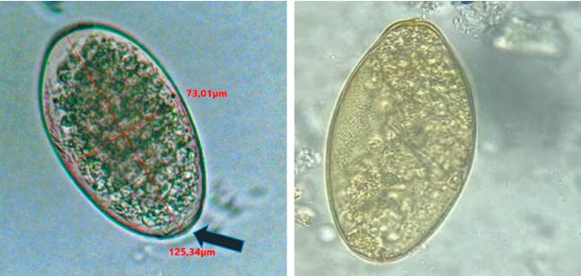 Рис. 2, 3. Яйца трематоды вида Fasciola hepatica (стрелочкой указана крышечка; фото: Акбаев Р.М.) Данные исследований о распространенности фасциолеза овец представлены в таблице 1. Таблица 1 Распространенность фасциолеза овец, содержащихся в хозяйствах разных форм собственности, расположенных на территории 7 районов Владимирской области | Район Владимирской области | Исследовано, особей | Инвазированно, особей | ЭИ, % | | Гусь-Хрустальный | 23 | 3 | 13 | | Камешковский | 26 | 0 | 0 | | Кольчугинский | 25 | 0 | 0 | | Судогодский | 25 | 9 | 36 | | Собинский | 24 | 24 | 100 | | Суздальский | 27 | 10 | 37 | | Гороховецкий | 26 | 8 | 30 | | Всего исследовано | 176 | 54 | 30,7 | На основании проведенных исследований, приведенных в таблице 1, фасциолез выявлен у животных, содержащихся в хозяйствах, расположенных на территории 5 из 7 районов Владимирской области, что свидетельствует о широком распространении гельминтоза. При этом экстенсивность инвазии составила от 13% (Гусь-Хрустальный район) до 100% (Собинский район). В биоматериале от животных, содержащихся в хозяйствах, расположенных в двух районах (Кольчугинском и Камешковском), яйца фасциол не обнаружили. Также отмечаем тот факт, что интенсивность инвазии при хроническом течении фасциолеза животных невелика, поскольку в трех полях зрения микроскопа мы обнаружили от 1 до 3 яиц фасциол. Клинические признаки болезни животных с подтвержденным диагнозом на фасциолез не проявлялись. При вскрытии четырех овец и исследовании желчных протоков печени были обнаружены мариты фасциол (рисунок 4 и 5).  Рис. 4, 5. Мариты трематоды вида Fasciola hepatica (фото: Акбаев Р.М.) Заключение. В результате проведенных исследований выяснили, что на территории Владимирской области в хозяйствах разных форм собственности широко распространен фасциолез овец, вызываемый трематодами, относящимися к виду Fasciola hepatica (Linnaeus, 1758). По результатам гельминтокопроско-пических исследований биоматериала от 176 овец по методу последовательных промываний в модификации Акбаева М.Ш., в 54 пробах были обнаружены яйца гельминта указанного вида. Таким образом, экстенсивность инвазии составила 30,7%. Кроме того, при послеубойном осмотре желчных протоков печени овец были обнаружены мариты гельминтов. Список литературы: 1. Абонеев В. В., Марченко В. В., Горковенко Л. Г., Куликова А. Я. Комплексная оценка потомства производителей южной мясной и кавказской пород овец. Главный зоотехник. 2017; (5): 5-13. 2. Акбаев М. Ш., Архипов А. В., Акбаев Р. М. Романовские овцы в условиях фермерских и индивидуальных хозяйств Нечерноземья: (разведение, кормление, содержание, профилактика и лечение некоторых заразных и незаразных болезней). 2016: 156 с. 3. Акбаев Р. М. Эктопаразиты кур и зоофильные мухи в промышленном птицеводстве и усовершенствование мер борьбы с ними в условиях Московской области : специальность 03.00.19 : диссертация на соискание ученой степени кандидата ветеринарных наук. 2003: 159 с. 4. Акбаев Р. М. Эктопаразиты птицы на территории птицефабрик промышленного типа Нечерноземной зоны. Ветеринария. 2009; (10): 32-38. 5. Акбаев Р. М. К вопросу о фауне эктопаразитов птиц в частных птичниках. Ветеринария. 2010; (8): 36-40. 6. Акбаев Р. М. Дифференциальная диагностика клещей - возбудителей сар-коптоидозов животных и птиц. 2011: 71 с. 7. Акбаев Р. М. Дезинсекция и дезакаризация птицеводческих помещений. Птица и птицепродукты. 2011; (4): 14-15. 8. Акбаев Р. М., Бабичев Н. В. Использование те