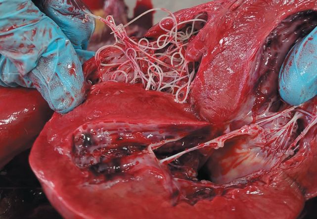 Рис. 3. Половозрелые D. immitis, обнаруженные в сердце собаки № 1 Единичные экземпляры нематод D. immitis были найдены в кровеносных сосудах легкого и печени указанных собак. Мышечная стенка сердца в области правого желудочка и предсердия была дрябловатая, на разрезе обнаружена дилатация и дистрофия миокарда. Нами выявлена рыхло-свернувшаяся, темно-красного цвета кровь животных. У собак №1, № 2 и № 3 отмечали застойную гиперемию и отек легких с участками альвеолярной эмфиземы в некоторых долях. Печень всех собак была не увеличена, с острыми краями, красно-коричневого цвета, полнокровная на разрезе. На органе имелись прижизненные краевые разрывы и отмечалась паренхиматозная дистрофия. Желчный пузырь собак был наполнен желчью густой консистенции. Нами выявлены реактивные изменения брыжеечных лимфатических узлов, на разрезе они имели серо-белый цвет. У собак № 2 и № 4 установлены половозрелые D. repens в подкожной и мышечной клетчатках, где раннее были отмечены участки алопеции и места расчесов при наружном осмотре. При дальнейшем исследовании нематоды также обнаружены в подкожной клетчатке и фасции мышц на внутренних поверхностях бедер и в паховой области животных. В местах их локализации ткани были инфильтрированы серозным экссудатом и отечны. Результаты наших исследований согласуются с представленными в литературе сведениями о размерах особей D. immitis и D. repens, а также вызываемых последними патоморфологиче-ских изменениях органов у собак [1, 5]. Заключение. При патологоанатомическом исследовании четырех трупов собак из Зеленодольского и Арского районов Республики Татарстан выявлено два вида нематод - D. immitis и D. repens, которые вызывают, соответственно, сердечно-легочную и кожную формы дирофиляриоза. При этом одна из собак имела смешанную форму паразитирования дирофилярий: в ней выявлены как вид D. repens, так и D. immitis. Список литературы: 1. Байсарова З. Т. Биология и морфология D. repens и D. immitis. Международный научно-исследовательский журнал. 2021; (3-2): 11-15. 2. Волкова Н. И., Пашкин А. В., Пашкина Ю. В. [и др.]. Дирофиляриоз плотоядных в пригородной зоне Среднего Поволжья. Вестник Нижегородской государственной сельскохозяйственной академии. 2020; (1 (25): 18-23. 3. Чистенко Г. Н., Веденьков А. Л., Дронина А. М. [и др.]. Дирофиляри-оз человека. Медицинский журнал. 2013; (45 (3): 30-33. 4. Кравченко В. М., Кравченко Г. А. Методы диагностики и сравнение различных методов лечения дирофиляриоза у собак. Молодой ученый. 2017; (9 (143): 174-176. 5. Гаврильева Л. Ю., Коколова Л. М., Сивцева Е. В. [и др.]. Опасность распространения Dirofilaria immitis у собак в центральной Якутии, лечебно-профилактические и санитарно-гигиенические мероприятия. Ветеринария и кормление. 2021; (5): 11-15. 6. Ксембаев С. С., Иванов О. А., Торгашова О. Е. [и др.]. Подкожный филяриоз челюстно-лицевой локализации - редкое клиническое наблюдение. Казанский медицинский журнал. 2018; (99 (5): 829-832. 7. Решетников А. Д., Барашкова А. И. Видовой состав и экология кровососущих комаров (Diptera, Culicidae) Якутии. Российский паразитологический журнал. 2023; (17 (1): 19-27. 8. Саакян С. В., Амирян А. Г., Тацков Р. А. [и др.]. Лучевая диагностика паразитарных поражений органа зрения. Российский электронный журнал лучевой диагностики. 2016; (6 (2): 16-21. 9. Pekacz M., Basalaj K., Miterpakova M. et al. An unexpected case of a dog from Poland co-infected with Dirofilaria repens and Dirofilaria immitis. BMC Vet. Res. 2024; (20 (1): 66-75. 10. Gruntmeir J., Kelly M., Ramos R. A. N. et al. Cutaneous filarioid nematodes of dogs in the United States