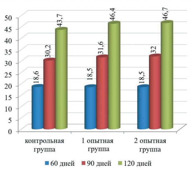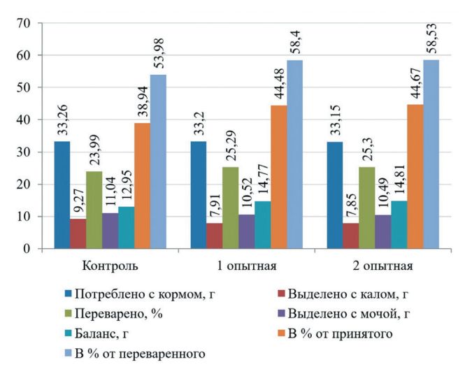 Рис. 1. Результаты взвешивания, кг При постановке поросят на исследование их вес был одинаковым и составлял 18,5-18,6 кг. Но к концу первого месяца выращивания живая масса поросят в первой и второй опытным группам увеличилась на 4,6% и 5,9%, соответственно, относительно контроля. В следующий месяц выращивания, когда возраст поросят достиг 4 месяцев, живая масса поросят в опытных группах увеличилась на 6,2% и 6,9%, также относительно контрольной группы. Данные показатели доказывают целесообразность введение кормовой добавки в рацион поросят-отъемышей, причем кормовая добавка, состоящая из пробиотика и АУКД, показала лучший результат, относительно кормовой добавки, состоящей из пробиотика и бентонитовой глины. По следующим показателям видно, сохранность поросят была высокой и составила в контрольной и 1 опытной группе 96%, а во второй опытной группе – 100% (табл. 1). Таблица 1 Жизнеспособность поросят, % (n=25) | Показатели | Группа | | контрольная | 1 опытная | 2 опытная | | Пало голов | 1 | 1 | 0 | | Сохранность за весь период опыта, % | 96,0 | 96,0 | 100,0 | Важным показателем положительного действия комплексной кормовой добавки являются результаты балансового опыта. Итоги балансового опыта приведены на рисунке 2, из которого видно, что усвоение азота корма лучше проходит во 2 опытной группе, что выражается в результатах исследования.