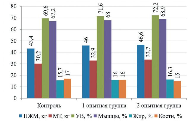 Рис. 3. Данные убоя (ПЖМ – предубойная живая масса, кг; МТ – масса туши, кг; УВ – убойный выход, %) Данные исследования по убою подтверждают целесообразность введения активной угольной кормовой добавки в комплексе со «Споротермином». Так, масса туши в контроле достоверно (Р>0,95) уступала этому же показателю 2 опытной группе – на 2,6% (рисунок 3). Относительно морфологического состава туши, также лучшие результаты во 2 опытной группе, а именно: масса мышц – на 1,4% достоверно (Р>0,95) больше относительно контроля. Что касается содержания жира, то здесь также лучшие показатели во 2 опытной группе: выше на 0,6 %, при меньшем содержании костей – на 2,0 % (Р>0,95). Заключение. Результаты исследований показали положительный результат в использовании активной угольной кормовой добавки в количестве 400 г на 1 т корма при комплексной введении с пробиотиком «Споротермин» в кормлении поросят-отъемышей. Список литературы: 1. Юнусова О. Ю., Сычева Л. В., Мальчиков Р. В. Влияние витаминно-минеральной добавки на переваримость и использование питательных веществ рациона молодняка свиней на откорме. Вестник мясного скотоводства. 2017; (1 (97). 2. Иванов Е. А. Влияние комбинированной кормовой добавки на основе премикса «Биолекс» и бентонитовой глины на качество свинины. Кормление сельскохозяйственных животных и кормопроизводство. 2017; (5): 34-39. 3. Konieczka P., Ferenc K., Lipinski K. Feeding Bacillus-based probiotics to gestating and lactating sows is an efficient method for improving immunity, gut functional status and biofilm formation by probiotic bacteria in piglets at weaning. Animal Nutrition. 2023; (13): 361-372. 4. Zhao J. et al. Effects of inclusion level and adaptation period on nutrient digestibility and digestible energy of wheat bran in growingfinishing pigs. Asian-Australasian journal of animal sciences. 2018; (31 (1): 116. 5. Newman M. A. et al. Transglycosylated starch improves insulin response and alters lipid and amino acid metabolome in a growing pig model. Nutrients. 2017; (9 (3): 291. 6. Barbosa K. A., Genova J. L., Carvalho P. L. O. et al. Effects of combined feed additives in diets to support growth performance and intestinal health profile in nursery piglets. Livestock Science. 2022; (266): 105121. 7. Черепанов И. В., Лебедева И. А. Экономическая целесообразность применения пробиотического препарата «Бацелл» при выращивании и откорме свиней. Белгородский агромир. 2009; (1): 41-42. 8. Чернышов Е. В. Опыт применения активной угольной кормовой добавки (АУКД) в рыбоводстве. Научные основы повышения продуктивности сельскохозяйственных животных: сборник научных трудов СКНИИЖ по материалам IX международной научно-практической конференции. 2016; (2): 142-146. 9. Необутова М. А., Дорофеева С. Г. Влияние кормовой добавки с пробиотиком на продуктивность поросят-сосунов. Свиноводство. 2024; (2): 35-36. 10. Короткий В. П., Макарова Л. Н., Прытков Ю. Н. [и др.]. Влияние адсорбентов микотоксинов кормов кормовых добавок «Активсор-бент», «Полиактив» на переваримость питательных веществ рационов поросятами на доращивании. Зоотехния. 2023; (8): 19-21. 11. Явников Н. В. Определение эффективности применения пре-биотической кормовой добавки «Стимвет» на поросятах. Международный вестник ветеринарии. 2020; (4): 62-68. 12. Мысик А. Т., Походня Г. С., Алексеенко А. Н. [и др.]. Зоотехническая и экономическая эффективность скармливания кормовой добавки «Элевит» поросятам на откорме. Зоотехния. 2024; (7): 17-20. Сведения об авторах: Каиров Валерий Рамазанович, доктор сельскохозяйственных наук, профессор кафедры зоотехнии ФГБОУ ВО «Горский ГАУ»; 362040, Республика Северная Осетия-Алания, г. Владикавказ, ул. Кирова, д. 37; тел.: 8-928-9312490; е-mail: ggau-dis-zoo@mail.ru. Булацева Светлана Владимировна, кандидат сельскохозяйственных наук, доцент кафедры растен