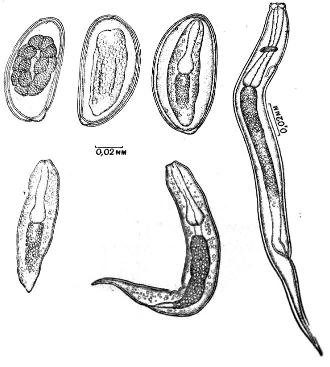 Рис. 1. Фрагменты тела нематод вида Passalurus ambiguus (Rudolphi, 1819) по Шульцу [34]: 1 – головной конец самки (желтой стрелкой отмечен пищевод; черной – бульбус); 2 – головной конец самки апикально; 4 – хвостовой конец самца (красной стрелкой отмечена спикула; голубой – тонкий отросток); 5 – хвостовой конец самки; 6 – кольцевидные образования кутикулы впереди хвостового острия у самки  Рис. 2. Яйца и личинки нематоды вида Passalurus ambiguus на разных стадиях развития (по Харичковой) [33] Локализация. Нематоды Passalurus ambiguus локализуются в слепой и ободочной кишках зайцеобразных. Имагинальные сам-ковые особи в период откладки яиц мигрируют к прямой кишке и локализуются у выхода из ануса [28,30,32,33,40,41]. Биология развития. Развитие пассалурусов протекает по ок-сиуридному типу [27, 28, 33], без участия промежуточных хозяев. Таким образом, пассалурусы являются геогельминтами [8]. Самцы, оплодотворив самок, погибают и впоследствии выбрасываются наружу во внешнюю среду вместе с фекалиями. Оплодотворенные самки продвигаются из слепой и прямой кишки к анусу, где у выхода откладывают яйца между криптами стенки кишечника, или на шерсть вокруг ануса. Впоследствии самки также погибают. Часть яиц попадают во внешнюю среду вместе с фекалиями. Инвазионной стадии яйца, отложенные в перианальной зоне или попавшие во внешнюю среду, достигают за 24-48 ч [27, 28]. В яйцах в этот период растут, развиваются и созревают личинки третьей стадии (larva III). Кролики заражаются, проглатывая такие яйца. В организме животных личинки достигают стадии имаго через 1,5 – 3 недели. Продолжительность жизни нематод составляет 60-100 суток [28]. Эпизоотологические данные. Пассалуроз – широко распространенная болезнь кроликов, содержащихся в хозяйствах разных форм собственности на территории России. Зарегистрирован в хозяйствах Кировской [15], Московской [24], Владимирской [19], Омской [22], Ленинградской [26], Кемеровской [29], Иркутской [16] областей, Краснодарского [39], Хабаровского [35] и Ставропольского [38] краях, во Владивостоке [31]. Источник заражения животных – это больные кролики и носители инвазии [14, 27]. Заражение животных пассалурозом происходит при поедании корма или питье воды, загрязненных инвазионными яйцами гельминтов. Поскольку кролики испытывают зуд при выхождении гельминтов из ануса (в особенности самок, откладывающих яйца), то кролики часто расчесывают передними лапками или вылизывают анальную область, таким образом происходит повторное заражение [32, 33]. Кролики подвержены копрофагии или цекотрофии (лат. caecum – слепая кишка + греч. trophe – пища, питание) [8, 14]. Данное явление распространено у кроликов вследствие недостатка в рационе минералов и протеинов. Кроликам для нормального деятельности желудочно-кишечного канала необходимы цекотрофы – комочки бактерий, выделяющиеся из ануса в результате их бурного размножения в аппендиксе и слепой кишке [27]. Заглатывая цекотрофы, кролики одновременно заглатывают и яйца. По данным некоторых авторов, молодые животные заражаются чаще и значительно интенсивнее [28], и в неблагополучных по пассалурозу хозяйствах зараженными могут быть до 50-90% кроликов при интенсивности инвазии до нескольких десятков тысяч гельминтов у одного животного [27]. К примеру, по данным Акбаева М.Ш., при проведении исследовательской работы на кро-ликофермах на территории Московской области интенсивност