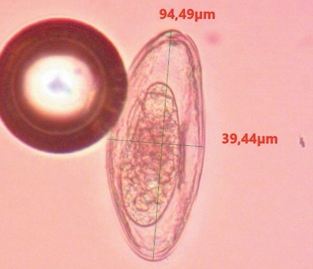 Рис. 3. Яйцо Passalurus ambiguus (Rudolphi, 1819) (фото: Акбаев Р. М.) В биоматериале от остальных 60 кроликов яйца пассалурусов не обнаружили. В свежих фекалиях обследуемых больных животных нами были обнаружены гельминты, которых мы морфологически идентифицировали как нематод Passalurus ambiguus (рисунок 4).