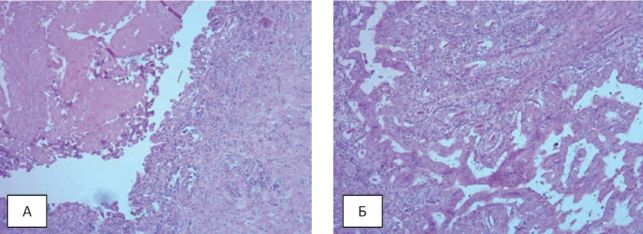 Рис. 1. Яичник с фолликулами  Рис. 2. Локальные участки шаровидного образования в рогах маток Исследования внутренних репродуктивных органов (яичников и матки) лисиц проводились в период весеннего забоя. Были установлены утолщения рогов матки, некоторые с гнойным содержимым; на некоторых рогах матки отмечались шаровидные образования (рисунок 2). При разрезе этих новообразований обнаруживали густую коричневую массу. Макроскопически яичники имели бугристую поверхность с признаками наличия желтого тела и фолликулов. При гистологическом исследовании установлено кровенаполнение вен миометрия. Миометрий в состоянии резкой компрессии, заметны массивные некрозы клеток и тотальное отхождение эндометрия в просвет. В строме шейки матки визуализируется слабая лимфоидно-клеточная инфильтрация, просвет шейки матки расширен, эпителий с признаками вакуолизации цитоплазмы. В просвете рога матки, в данном участке, предположительно, заметны клетки трофобласта, однако их дифференцировка значительно затруднена (рисунок 3). В участках рога матки без расширения, ближе к описываемому выше участку визуализируется массивный пласт, в просвете, состоящий из десквамированного цилиндрического эпителия слизистой оболочки матки, некротических масс и оксифильного вещества. Чуть дистальнее, заметна массивная десквамация эпителиального слоя в просвет матки, железы эндометрия здесь расширены, с обильным секретом (рисунок 4). В корковом слое яичника выявлены фолликулы на разной стадии развития, и обильная инфильтрация стромы яичника лимфоцитами, единично – атрети-ческие тела. В препарате выявлено два массивных жёлтых тела с тенденцией к васкуляризации лютеоцитов. Просвет шейки матки расширен, содержит оксифильный экссудат, эпителий с признаками вакуолизации (рисунок 5). Частота встречаемости эндометритов у лисиц представлена в таблице 1. Таблица 1 Частота встречаемости эндометрита у лисиц | эндометрит | 1 | 2% | | эндометрит и цервицит | 3 | 6% | | железисто-кистозная гиперплазия эндометрия, эндометрит и оофорит | 4 | 8% |