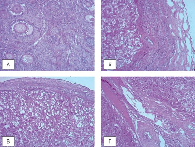 Рис. 3. Гистологические срезы: а – поперечный и продольный слои миометрия; б, в – резкое расширение желёз эндометрия; г – просвет рога матки с некротическими массами (гематоксилин и эозин, х100)  Рис. 4. Гистологические срезы эндометрия (гематоксилин и эозин, х100)  Рис. 5. Гистологические срезы: а – корковое вещество яичника с воспалением стромы; б – корковое вещество яичника с воспалением стромы; в – жёлтое тело с вакуляризацией цитоплазмы лютеоцитов, в краевых отделах; г – два жёлтых тела с соединительнотканной перегородкой (гематоксилин и эозин, х100) Заключение. По результатам проведенных исследований установлено, что у лисиц пропустовало 94% самок из 2000. Результаты гистологических исследований репродуктивных органов лисиц указывают на возможные нарушения гормонального фона в их организме. Список литературы: 1. Кочуева Н. А., Бочкарев В. Н., Гарнцева Н. В. Адаптационные процессы в организме плотоядных при остром послеродовом эндометрите. Ветеринарная патология. 2008; (2): 84-88. 2. Слугин В. С. Болезни плотоядных пушных зверей и их этиологическая связь с патологией других животных и человека. КОГУП «Кировская областная типография». 2004: 592 с. 3. Чекалова Т. М., Матвеева С. В. Анализ воспроизводительной способности стада Вятских красных лисиц «огневок». МГАВМиБ им. К.И. Скрябина. 2001: 266-267. 4. Емельянова Н. С. Эндометриты домашних плотоядных. 2007: 22 с. 5. Владимиров А. В., Еремина Т. С., Семикрасова А. Н., Писаренко Н. А. Система гинекологической диспансеризации песцов и лисиц. Российский ветеринарный журнал. 2007: 45. 6. Меркулов Г. А. Курс патолого-гистологической техники. Медицина. 1969: 422 с. 7. Sorum H. et al. An Outbreak of Septic Endometritis in the Arctic Blue Fox (Alopex Lagopus) caused by Clostridium Carnis. Acta vet. scand. 1988; (29): 181-191. Сведения об авторах: Жилина Ксения Владимировна, ветеринарный врач лаборатории экспериментального кролиководства ФГБНУ «Научно-исследовательский институт пушного звероводства и кролиководства имени В.А. Афанасьева»; 140143, Московская область, Раменский район, пос. Родники, ул. Трудовая, 6; e-mail: niipzk@mail.ru. Ответственный за переписку с редакцией: Семикрасова Алла Николаевна, кандидат биологических наук, научный консультант ФГБНУ «Научно-исследовательский институт пушного звероводства и кролиководства имени В.А. Афанасьева»; 140143, Московская область, Раменский район, пос. Родники, ул. Трудовая, 6; тел.: 8-496-4648681; e-mail: niipzk@mail.ru. Заявленный вклад авторов: рукопись была написана благодаря вкладу всех авторов. Все авторы одобрили окончательную версию рукописи. Конфликт интересов: авторы заявляют об отсутствии конфликта интересов.